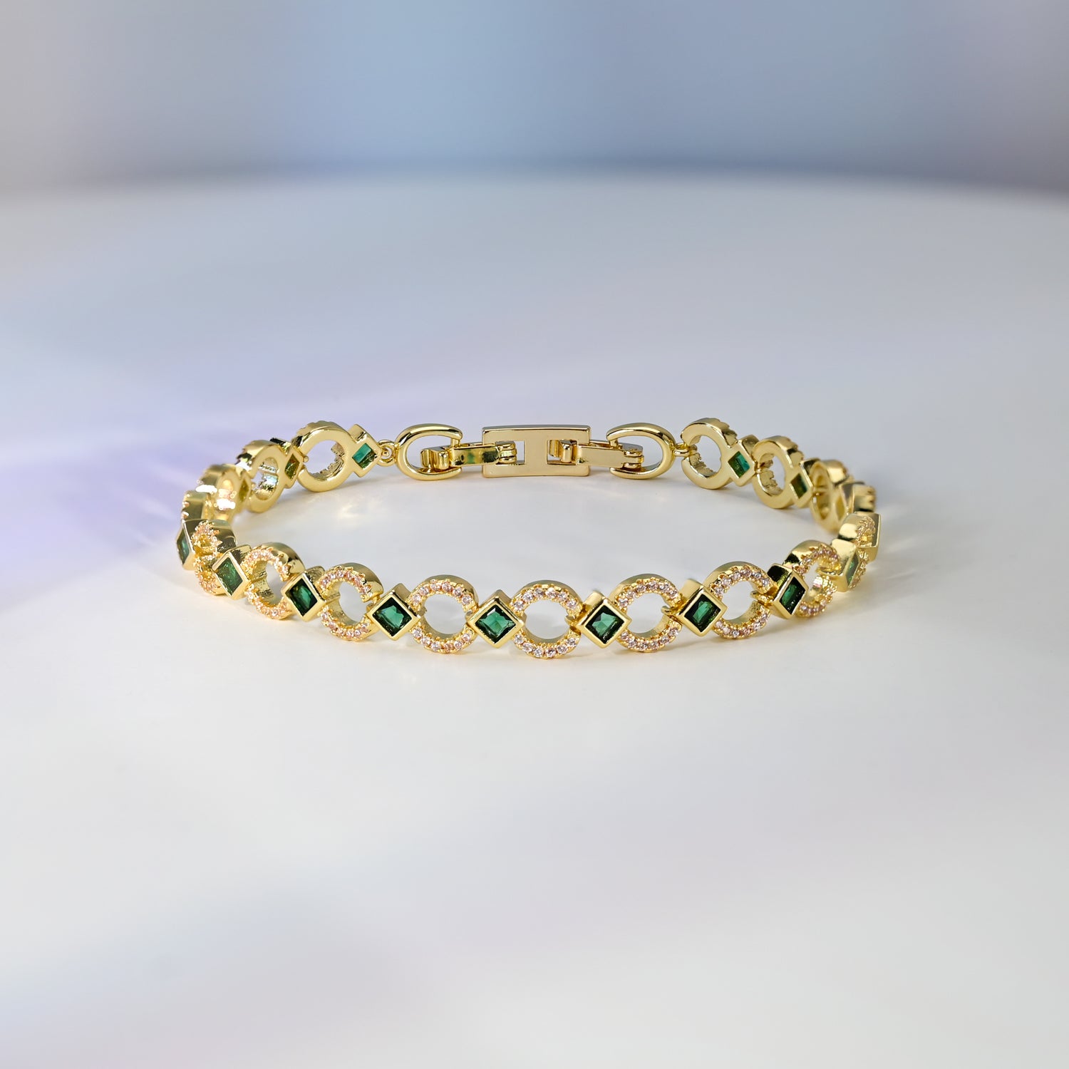 Radiate timeless elegance with the Gilded Halo Bracelet in Emerald. Crafted in 18K plated gold, this stunning bracelet features shimmering zircon-encrusted halos of light, accented by brilliant emerald zircon stones in a regal diamond shape. This is the perfect meaninful gift for someone special, including yourself! Every purchase supports Starfish Project, helping women build bright, independent futures. Thank you for choosing jewelry with purpose.
